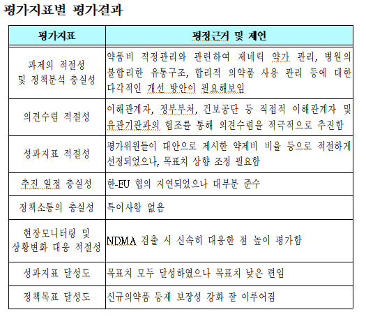 보건복지부 2019년 자체평가 결과보고서에 따르면, 보험약제 보장성 강화 및 약품비 적정관리 과제는 사회적 요구도와 의료비 부담이 높은 항암 및 희귀질환 약제 신규등재 등 보장성 강화와 ‘제네릭 의약품 약가제도 개편 방안’ 발표 등 제네릭 의약품 관리 강화가 주요 성과로 꼽혔다.