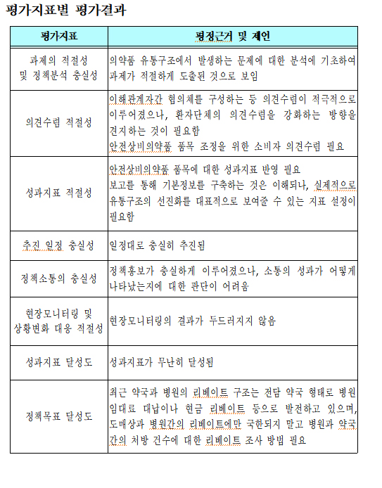 작년에는 다소미흡이라는 성적을 받았는데, 환자 및 소비자 의견수렴을 적극적으로 실시하고 의약품 유통구조 선진화를 담아낼 수 있는 성과지표 개발해야 한다는 평가다.