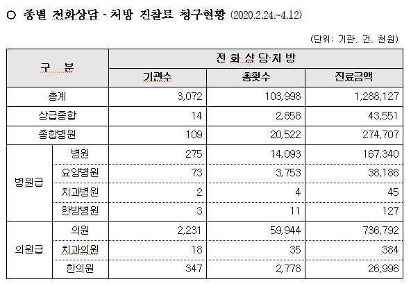 중앙재난안전대책본부는 20일 종별 전화상담·처방 진찰료 청구현황을 공개했다. 기간은 전화처방을 실시한 2월 24일부터 4월 12일까지다.