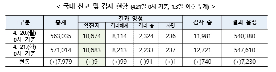 중앙재난안전대책본부는 21일 기준으로 코로나19 확진자 수는 1만 683명이며, 신규 환자는 9명으로 나타났다고 밝혔다. 격리중인 환자는 2233명이며, 사망자는 237명이다.