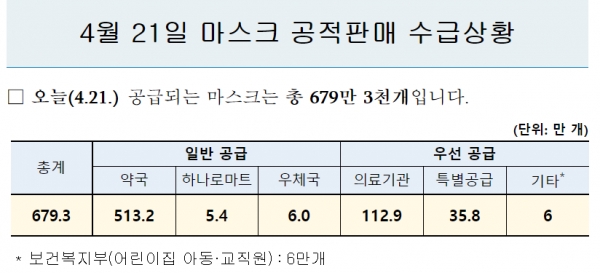 21일(오늘) 공적판매처 등을 통해 공급된 공적마스크는 총 679만3000개다.