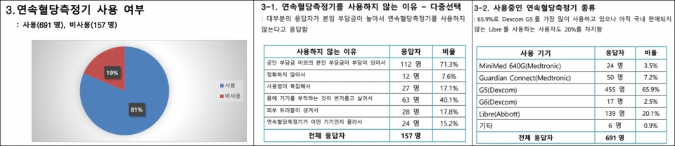 연속혈당측정기를 쓰는 응답자(부모 회원 응답자 자녀)는 691명(81%)에 달했다. 반면, 쓰지 않는 응답자는 157명(19%)였다. 쓰지 않는 이유는 "공단 부담금 외 본인 부담금이 부담이 돼서(높아서)"가 112명(71.3%)에 달했다.