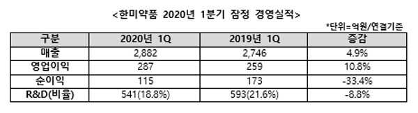 한미약품(대표이사 우종수?권세창)은 2020년 1분기 연결회계 기준으로 전년 동기대비 4.9% 성장한 2882억원의 매출을 올렸다고 28일 밝혔다.