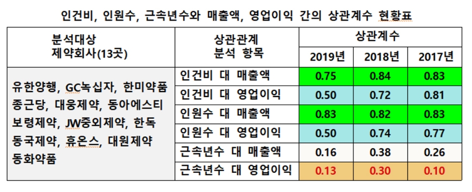 히트뉴스가, 제약회사들의 ▷인건비 대 매출액 및 영업이익 간의 상관성, ▷인원수 대 매출액 및 영업이익 간의 연관성, 그리고 ▷근속년수 대 매출액 및 영업이익과의 관련성 정도에 대해, '피어슨(Pearson)의 상관계수 산출 도구[r=ΣXY÷(√ΣX²×√ΣY²)]'를 활용해 분석해 봤다. 지난해 매출액 3천억 원 이상인, 대표성 있는 상장 제약회사 13곳의 자료를 대상으로 했다.