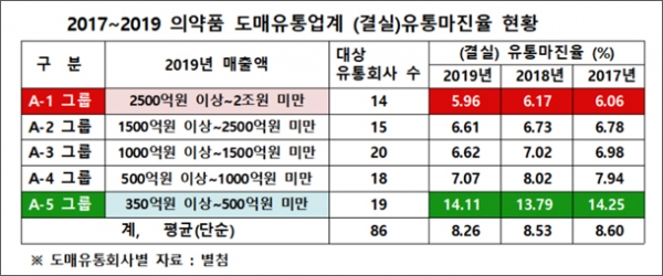 이 공식을 적용해, 86곳 도매유통사들의 3개년(2017년~2019년) 유통마진율을 5개 그룹으로 나누어 산출했다. 순수 도매유통업계의 유통마진율에 대한 왜곡을 없애고 그 진면목을 알기 위해, 제약도매(2곳), 병원직영으로 알려진 도매(9곳), 약국 프랜차이즈 도매(3곳) 및 1~2개년 실적만 공개된 도매(2곳)들을 분석 대상에서 제외했다. 다음 [표]와 같다.