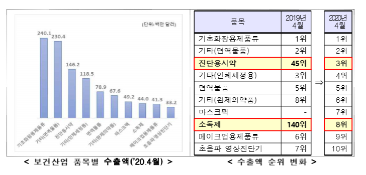 의약품(23.4%)과 의료기기(50.8%) 등의 4월 수출실적이 전년 동월 대비 급증한 것이다. 특히 진단용시약은 작년 수출액 45위에서 3위로 껑충 뛰어올랐다.