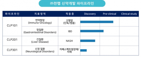 앞으로도 천랩은 신약개발본부와 마이크로바이옴 연구소와의 긴밀한 협력을 통해 신약 파이프라인을 꾸준히 확대해 나가면서 국내외 제약사와의 플랫폼 기반 공동개발도 적극 추진할 예정이다.