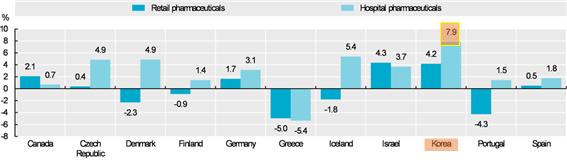 우리나라는 환자가 본인 부담하는 약제비율이 45%로 OECD 평균인 39%보다 다른 회원국들에 비해 높았다. 지난 10년 간 우리나라의 병원의약품(전문의약품)과 소매의약품(일반의약품) 소비는 각각 7.9%, 4.2% 늘었다.