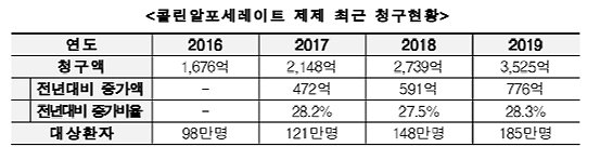 실제 콜린알포세레이트 제제는 올해 3월기준 229개 품목이 등재돼 있으며 2016년 98만명 환자에 1676억원이 청구됐고, 2017년 121만명에 2148억원, 2018년148만명에 2739억원, 작년 185만명에 3525억원을 청구, 3년 평균증가율이 약 28%에 달했다.