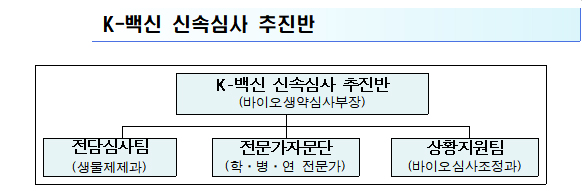 ‘K-백신 신속심사 추진반’은 백신 심사를 총괄하는 '전담심사팀', 내?외부 업무협력을 주관하는 '상황지원팀', 대한백신학회와 같은 학계?병원 등의 '외부전문가자문단’으로 구성된다.