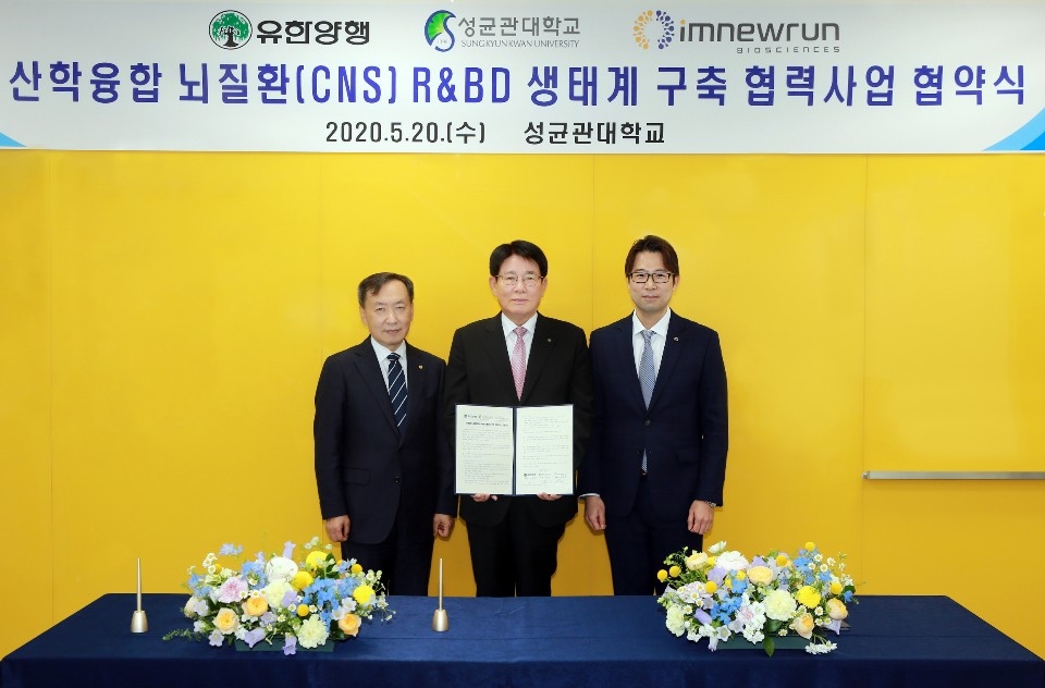 유한양행(이정희 대표이사 사장)은 성균관대학교(신동렬 총장), ㈜아임뉴런바이오사이언스(김한주 대표이사)와 3자 업무협약을 체결했다고 20일 밝혔다.