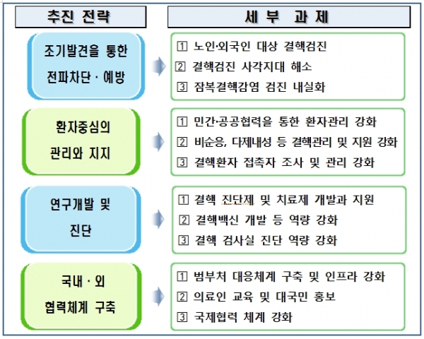 따라서 이번 2기 계획에는결핵 없는 사회, 건강한 국가를 비전으로 결핵 발생률을 낮추기 위해 5년간 중점을 둬 추진 할 대책들을 4개 분야별(조기발견을 통한 전파 차단, 환자 중심의 관리와 지지, 연구개발 및 진단, 국내외 협력체계 구축)로 제시됐다.