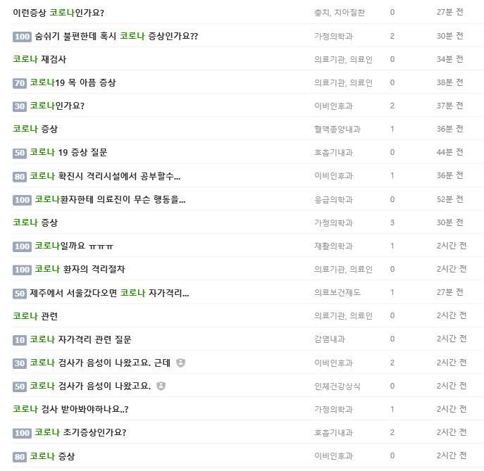뿐만 아니라 이와 같은 온라인을 통한 상담은 코로나19가 촉발한 ‘거리두기’라는 정책과 맞물리면서 코로나19 증세에 대한 질문이 쇄도 하고 있는 모습이다.