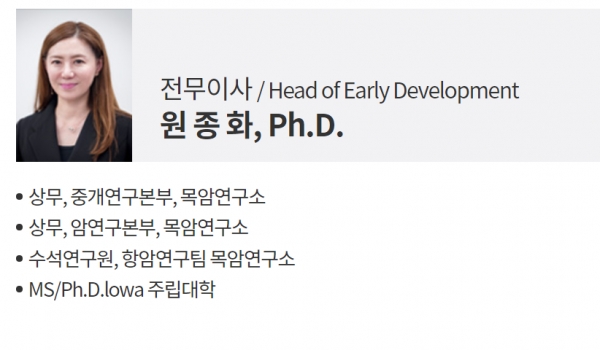원종화 임상중개연구&개발 전무(원)=간단하게 말하면 초기 개발(early development)이라고 할 수 있지만, 좀 더 복합적인 업무를 맡고 있어요. 신약 디스커버리(discovery) 업무에서 임상시험 진입하기 전 중개연구(translation research)까지 맡고 있거든요.