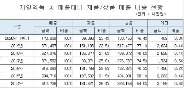 같은 기간 동안 제일약품이 개발 생산하는 자기 제품의 매출을 살펴보면, 2017년 930억 7100만원(분할이후인 6월부터 12월까지 매출), 2018년 1353억 7700만원, 2019년 1511억 1000만원이다.