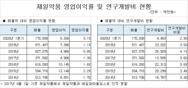 제일약품은 올 1분기 매출 1784억으로 국내 제약바이오업계 10위에 올랐지만 영업이익률은 3.1%에 그치는 저수익 사업모델이 지속되고 있다. 지난 2019년 영업이익률이 1.1%였다는 점을 감안할 때 개선된 듯 보이지만 10%에 육박하는 업계 평균에 비하면 낮다.