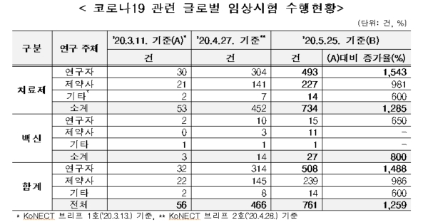 코로나19 치료제와 백신 관련 임상이 3월 대비 5월 13배 가량 증가한 것으로 나타났다.
