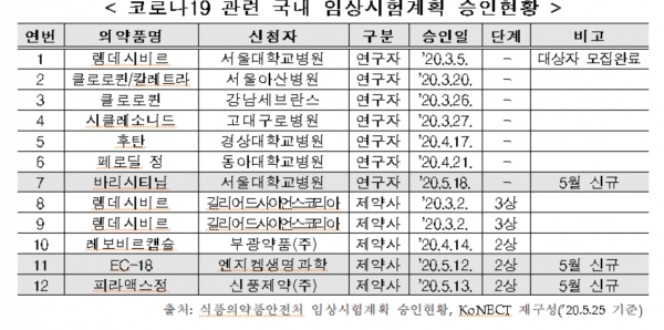 식품의약품안전처가 승인한 코로나19 관련 임상시험계획은 25일 기준 전체 12건이다. 이중 연구자 임상시험은 7건(58.3%)이 진행되고 있으며, 1건은 모집완료된 것으로 나타났다.