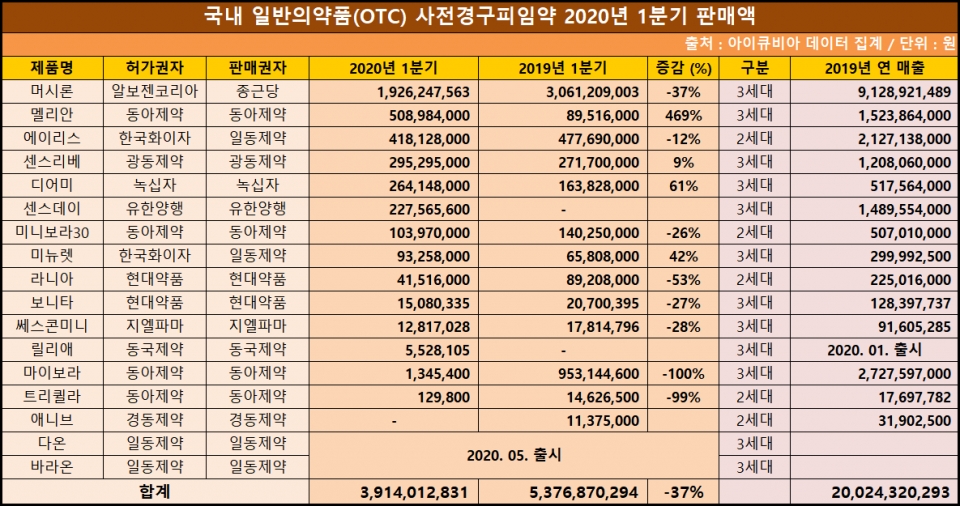 히트뉴스가 27일 의약품 시장조사기관 아이큐비아 데이터로 2020년 1분기 일반의약품 사전경구피임약 판매액을 분석한 결과 시장 1위인 알보젠코리아의 '머시론'은 19억2624만원으로 전년동기 30억원보다 37% 줄었다.