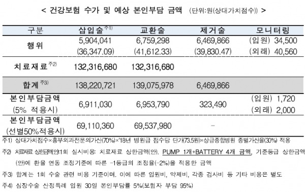 행위수가는 삽입술, 교환술, 제거술, 모니터링 수가로 구분하고, 치료재료는 신청금액의 최저가를 상한금액으로 결정하되 매년 모니터링을 통해 실시건수와 연계 상한금액 재평가를 추진한다. 최초 모니터링은 2019년 말까지 시행된 사례를 모아 2020년 중 실시할 예정이다.