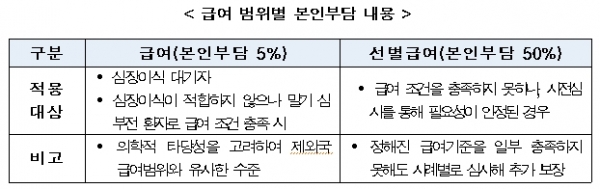 또 '심장이식 대체 수술(DT)’의 경우에도 일정 기준을 충족하는 경우 건강보험이 적용될 예정이다. 다만, 제외국에서도 치료효과성과 급여 적정성을 두고 논의가 진행중인 일부 적용 범위에 대해서는 별도의 ‘사전 심사 과정’을 통해 의학적으로 필요성이 인정되는 경우 추가로 보장을 받을 수 있도록 추진할 예정이다.