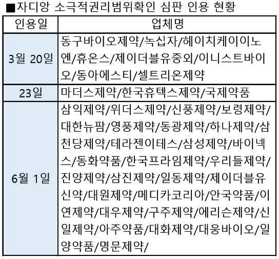 특허심판원은 3월 9일부터 4월 20일까지 32개사가 청구한 34개 소극적권리범위확신심판 청구를 이달 1일, 일괄 인용했다.