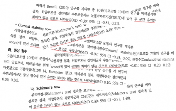 보고서에 따르면, 히알루론산 점안제는 △위약군간 효과 개선 △다른 점성물질들과 비교 연구 △안구건조증 개선을 위해 사용되는 보조물질과 비교연구 △Diquafosol, Cyclosporine 과 같은 활성물질(Active agent)과 비교평가에서 유의한 차이를 확인하지 못했다.