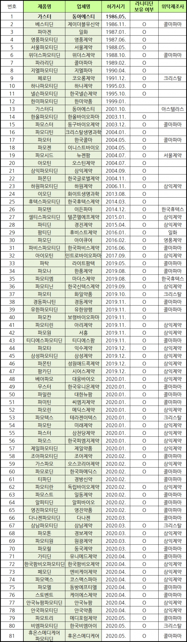 이처럼 가스터를 비롯한 파모티딘 제제가 '대체 효과'를 톡톡히 보니, 라니티딘 보유사들은 너도나도 파모티딘 제제 확보에 나섰다. 라니티딘 사태 직후 11월 6품목, 올 1월 10품목 등 매달 신규 품목은 끊이지 않아 38품목 늘었다. 국내 파모티딘 제제는 81품목으로 집계됐다.