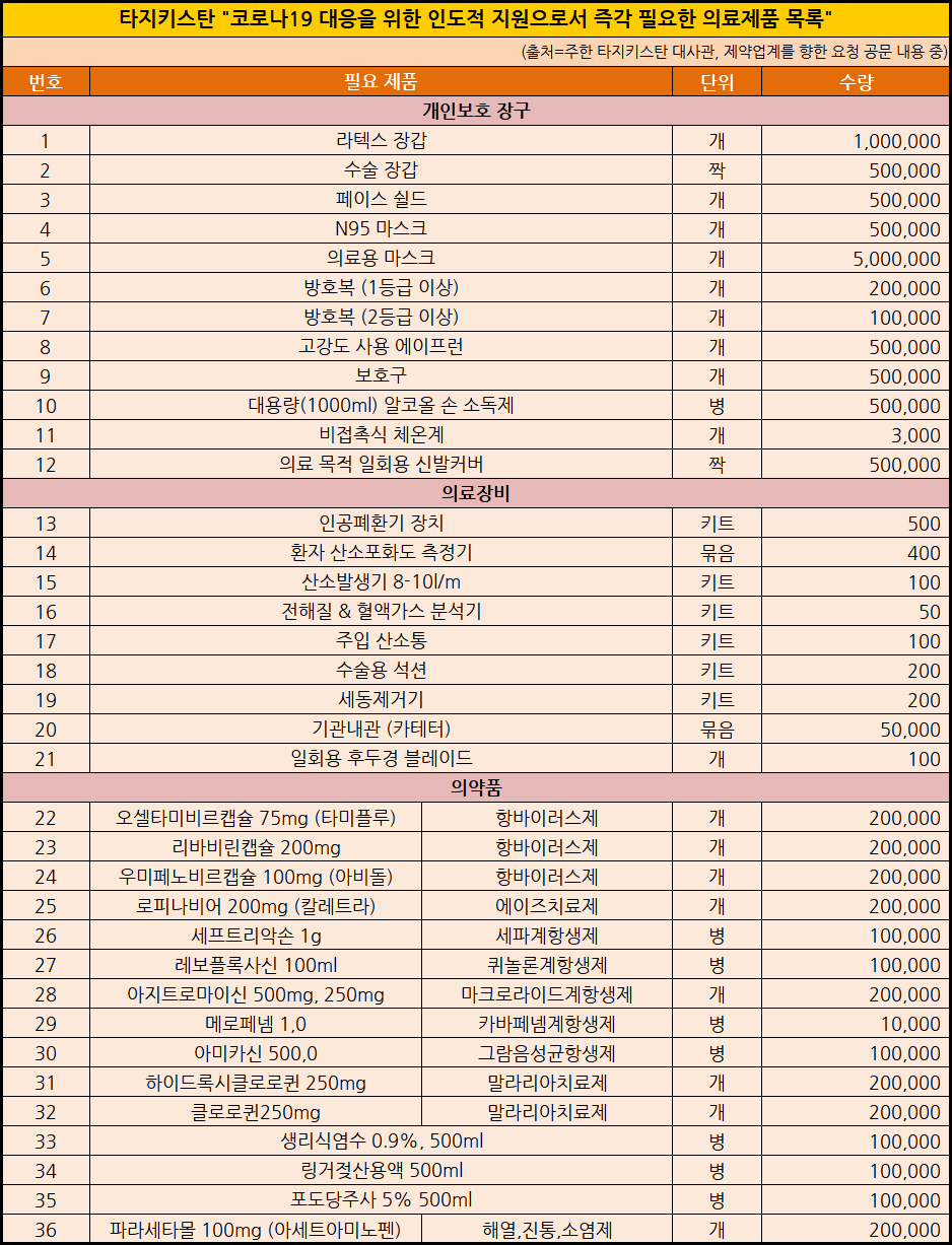 대사관은 "확진자들을 치료하는데 300~500 병상 확보가 시급하며 병원에 의료 장비를 갖춰야 한다. 타지키스탄이 코로나19를 예방할 수 있도록 약품과 장비 지원을 당부드린다"고 업계에 호소했다.