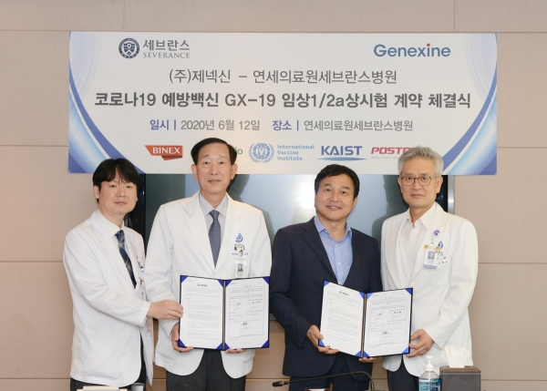 제넥신(대표 성영철)과 연세대학교 세브란스병원이 코로나19 예방 백신인 ‘GX-19’의 국내 1/2a상 임상시험 계약을 12일 체결했다.