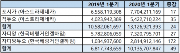자디앙은 전년 동기대비 27% 성장해 73억2079만원 매출을 올렸고, 자디앙 듀오(엠파글리플로진/메트포르민염산염)는 2019년 5월 고용량(12.5/500, 850, 1000) 출시로 매출이 고공행진, 2020년 1분기에만 28억1491만원의 매출을 기록했다. 2019년 1분기 보다 무려 172% 증가한 수치다.