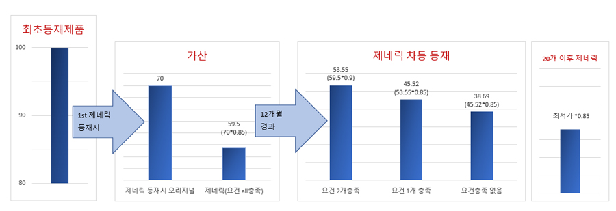 해당 품목들이 양도양수받는 과정에서 급여삭제 후 재등재가 이뤄질 경우 새로운 제네릭 약가제도에 따라 동일제제 최저가 85%으로 산정될 수 있다. 리피토와 노바스크 등 특허만료에 따라 수십여개 제네릭이 등재돼 있기 때문에 등재신청 20번째 안에 들 수 있는 상황은 아니다.