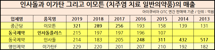 아이큐비아 자료에 따르면 치주염 시장은 종근당 이모튼이 지난해 321억원의 매출로 2018년 289억원과 대비해 11%(32억원)이 증가했디. 인사돌플러스는 215억원, 개량 전 품목인 인사돌은 214억원을 기록했다. 명인제약 이가탄F는 229억원을 기록했다.