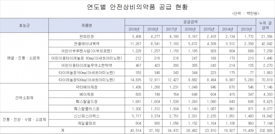 연도별 안전상비의약품 공급액은 2013년 154억3900만원, 2014년 199억2700만원, 2015년 239억 1000만원, 2016년 284억8200만원, 2017년 344억7200만원, 2018년 371억8200만원, 2019년 435억1400만원이었다.