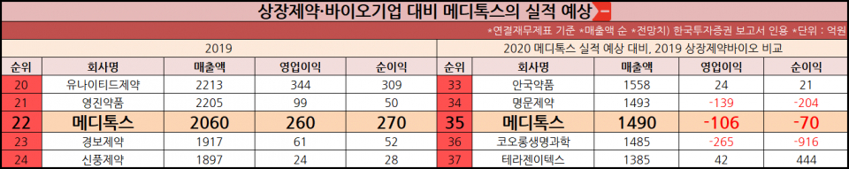메디톡스는 지난해 매출은 2060억 원이다. 하지만 올해는 메디톡신 공백으로 1490억원대로 감소할 것으로 중권가는 추산하고 있다. 106억원의 영업적자와 70억원의 순손실도 예상된다.지난해 상장기업들의 실적과 비교 시 메디톡스는 업계 30위 권으로 주저앉는다.
