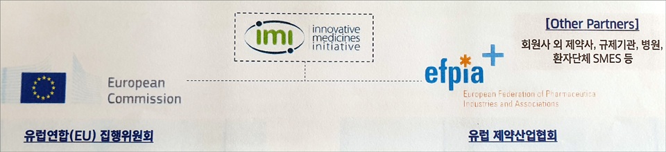 위 그림에 나타나는 유럽연합 집행위원회(EC)는 유럽연합의 행정부 역할을 각종 정책을 입안한다. EC는 유럽 연합(EU)의 Horizon 2020(2014부터 2020년까지 진행되는데 연구기금은 무려 98조6000억원에 이름)을 기반으로 IMI의 R&D 프로젝트를 지원하고 있다.