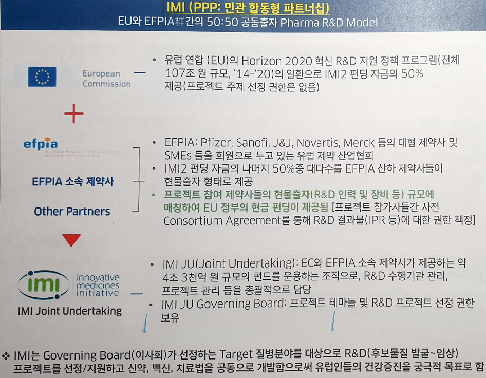 벤치마킹 모델이 된 IMI(Innovative Medicines Initiative ; IMI)는 유럽 제약산업연맹(EFPIA) 및 기타 민간기업과 유럽연합집행위원회(EC)간 50:50 공동 출자를 통해 회원국가 소속 산학연 및 규제기관과 환자협회의 보건산업에 관련된 R&D를 매칭하거나 지원하는 플랫폼이다.