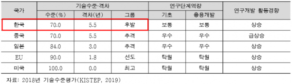 혁신신약개발 분야에서 한국이 최고기술국인 미국 대비 5.5년의 격차가 존재하며, 바이오헬스 분야는 3년 격차가 있다는 분석이 나왔다.