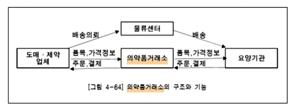 첫째, 앞의 그림을 보면, 의약품 거래소의 구조와 기능은 도매상의 그것과 아주 똑 같다. 그리고 도매상도 거래소를 통해 의약품을 요양기관에 유통하도록 하고 있다.