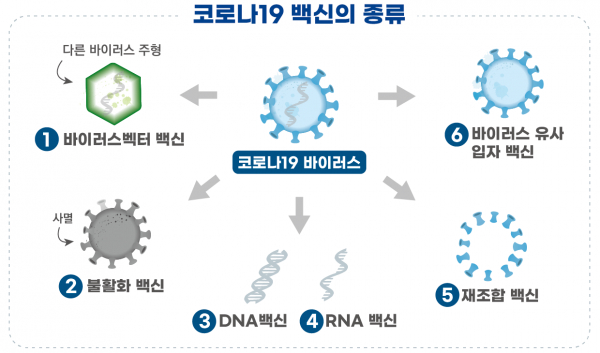 아울러 코로나19 백신은 전 세계적으로 바이러스 벡터 백신, 불활화 백신, DNA 백신, RNA 백신, 재조합 백신, 바이러스 유사입자 백신 등 총 6종이 개발 중에 있다.