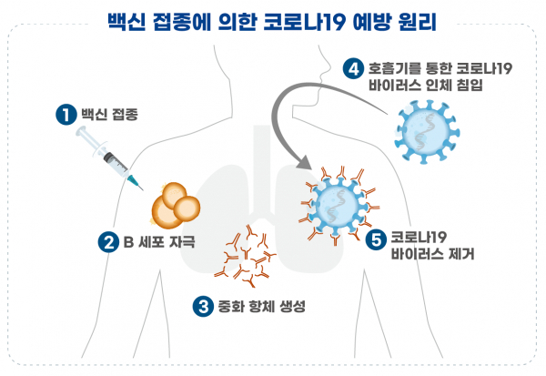 백신 접종에 의한 코로나19 예방 원리는 백신 접종으로 체내에 들어온 백신의 항원 성분이 B세포를 자극시킨다. 이 자극된 B세포에서 바이러스를 제거할 수 있는 중화 항체를 만들어 몸 속에 보관하고 있다.