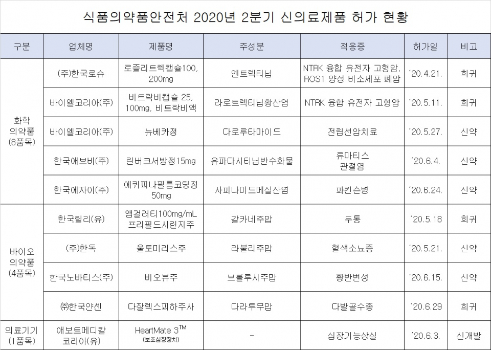 식품의약품안전처는 2020년 2분기에 신약 5개 품목을 비롯해 희귀의약품 7개 품목, 신개발 의료기기 1개 품목 등 총 13개 신의료제품이 허가됐다고 14일 밝혔다.