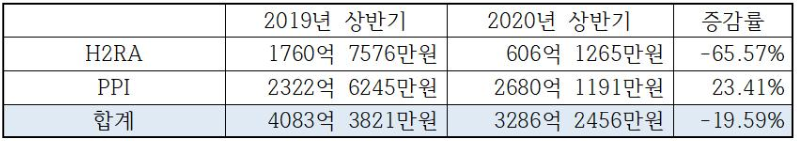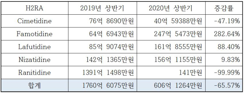 라니티딘을 제외했을 때, H2차단제 시장은 2019년 상반기 369억원에서 2020년 상반기 606억원으로 64%가량 증가했으며, 그 중 파모티딘제제는 64억원에서 247억원으로 282%의 고성장을 보였고 라푸티딘 역시 85억원에서 161억원으로 88%가 증가했다.