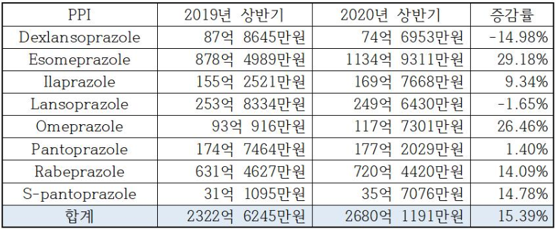 PPI 시장은 덱슬란프라졸 제제 원외처방액이 소폭(14%) 감소했지만, 에스오메프라졸, 오메프라졸이 각각 29%, 26% 증가했고 라베프라졸, 에스-판도프라졸이 각각 14%라는 준수한 증가율을 보이며, 2019년 상반기 2322억원에서 2020년 상반기 2680억원으로 약 15%의 시장 확대를 견인했다.