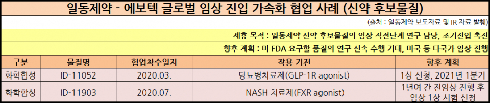 일동제약은 지난 3월부터 자사 신약 후보물질의 임상 직전 단계 연구 파트너로 독일의 신약 연구개발 전문회사 에보텍을 선정하고 글로벌 임상시험에 진입하기 위해 협력하고 있다.