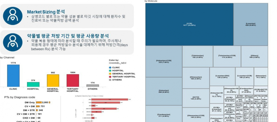 환자표본데이터를 통해 △익명화된 환자 정보 △병원정보(익명화된 임의의 고유번호) △진료정보(수술, 처치, 입원) △상병정보 △약물정보(처방일수, 처방량, 처방금액)를 추출할 수 있다. 이를 통해 △시장 규모 △약물 별 평균 처방 기간과 평균 사용량을 분석할 수 있다.