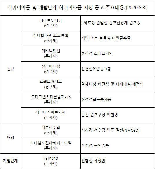 희귀의약품으로 지정된 품목은 ▲티라브루티닙(경구제, B세포성 원발성 중추신경계 림프종) ▲실타캅타젠 오토류셀(주사제, 재발 또는 불응성 다발골수종) ▲러비넥테딘(주사제, 전이성 소세포폐암) ▲셀루메티닙(경구제, 신경섬유종증 1형) ▲프레토마니드(경구제, 약제내성 폐결핵 및 다제내성 폐결핵) ▲로페그인터페론알파-2b)(주사제, 진성적혈구증가증) ▲페그아스파르가제(주사제, 급성 림프구성 백혈병) 등 7품목이다.