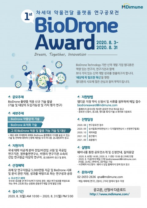 엠디뮨은 ‘1st BioDrone Award 차세대 약물전달 플랫폼’ 연구 공모전에 대한 이해를 돕기 위해 6일 오후 2시, 11일 오후 3시 두 차례에 걸쳐 웨비나를 진행한다"고 4일 밝혔다.