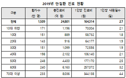 안질환=지난해 안질환으로 진료 받은 사람은 1509만 명으로 건강보험 적용대상자의 29.4%이며, 총 진료비는 2조 4801억 원으로 전체 건강보험 의료기관 진료비의 3.6%를 차지했다. 환자 1인당 진료비는 16만 4314원, 1인당 내원일수는 2.7일이다.