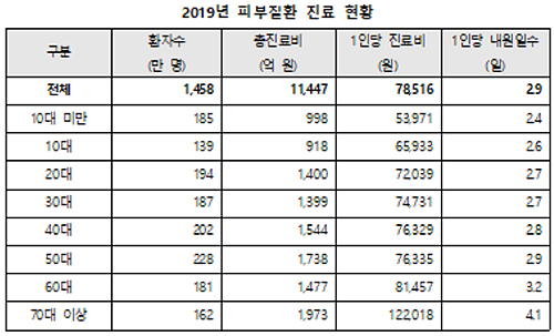 피부질환=2019년 연간 피부질환으로 진료 받은 사람은 1458만 명으로 건강보험 적용대상자의 28.4%이며, 총 진료비는 1조 1447억 원으로 전체 건강보험 의료기관 진료비의 1.7%를 차지했다. 환자 1인당 진료비는 7만 8516원, 1인당 내원일수 2.9일이다.